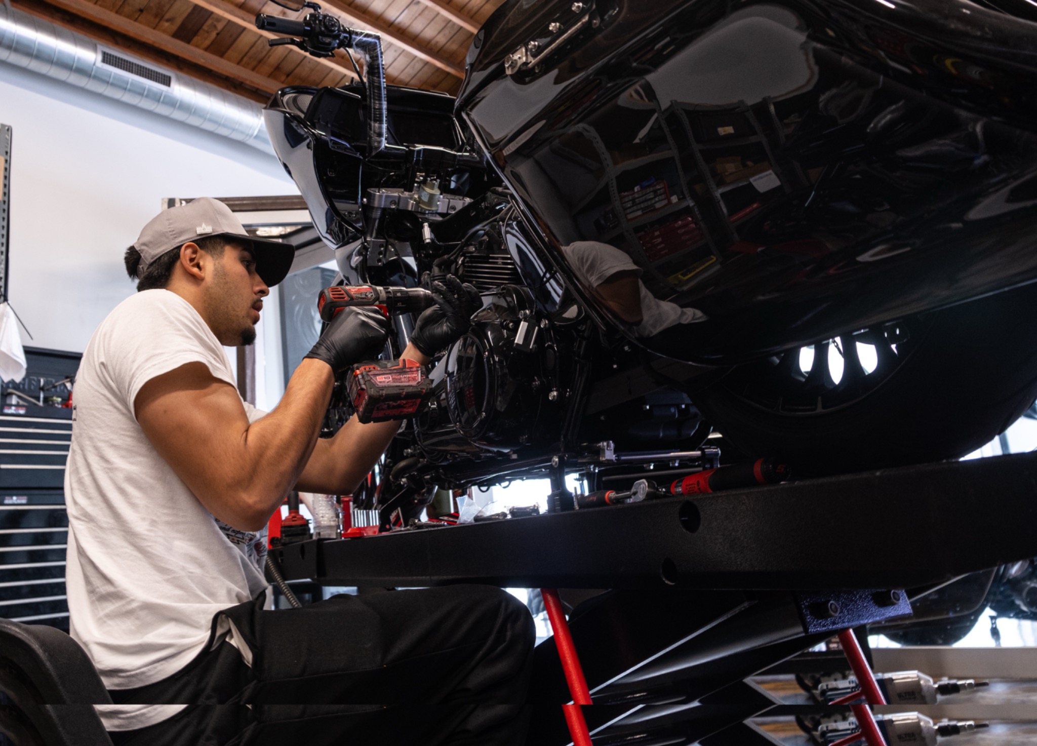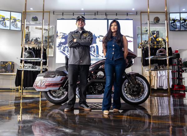Owner Mikey Loco (left) and the Chief Operations Officer, Diana Rodriguez (right) at Dirthbags Academy, a small business that sells custom Harley-Davidson motorcycles located on 1133 E Artesia Blvd, Long Beach, CA 90805 on Feb. 10. Charlotte LoCicero | Long Beach Current
