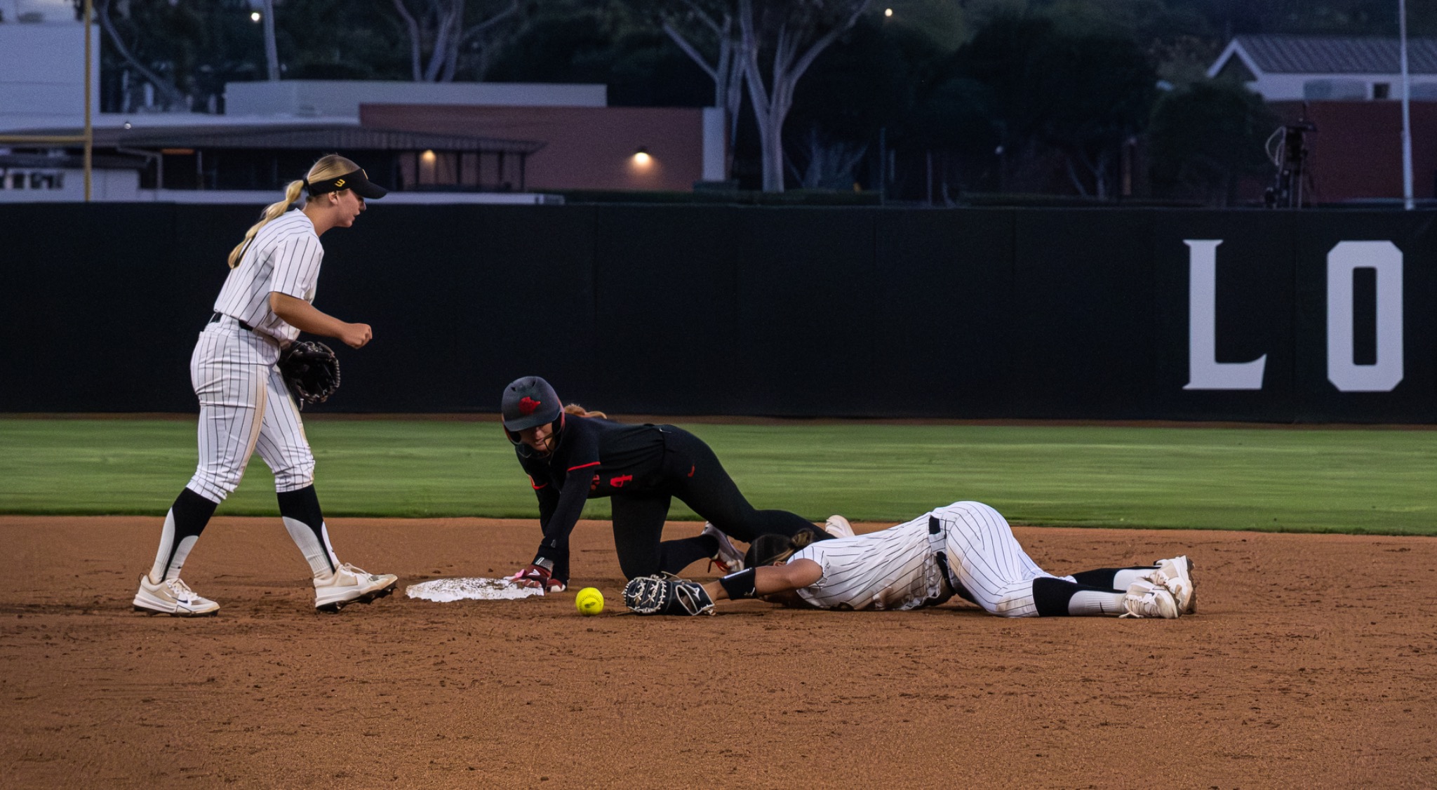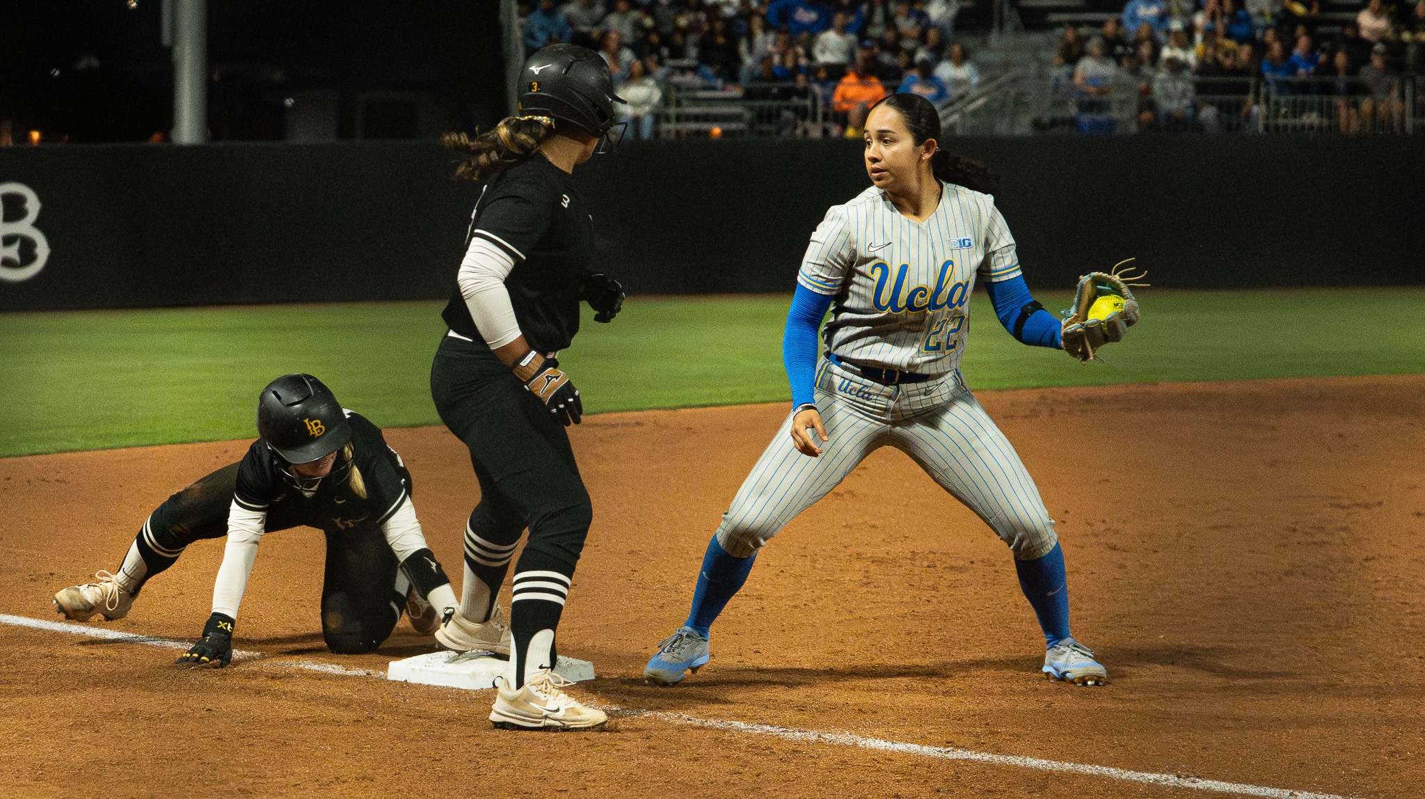 LBSU junior Avery Weisbrook and sophomore Priscilla Iniguez stay at third base as UCLA’s Bri Alejandre fields the ball on Wednesday, April 15. Charlotte LoCicero | Long Beach Current