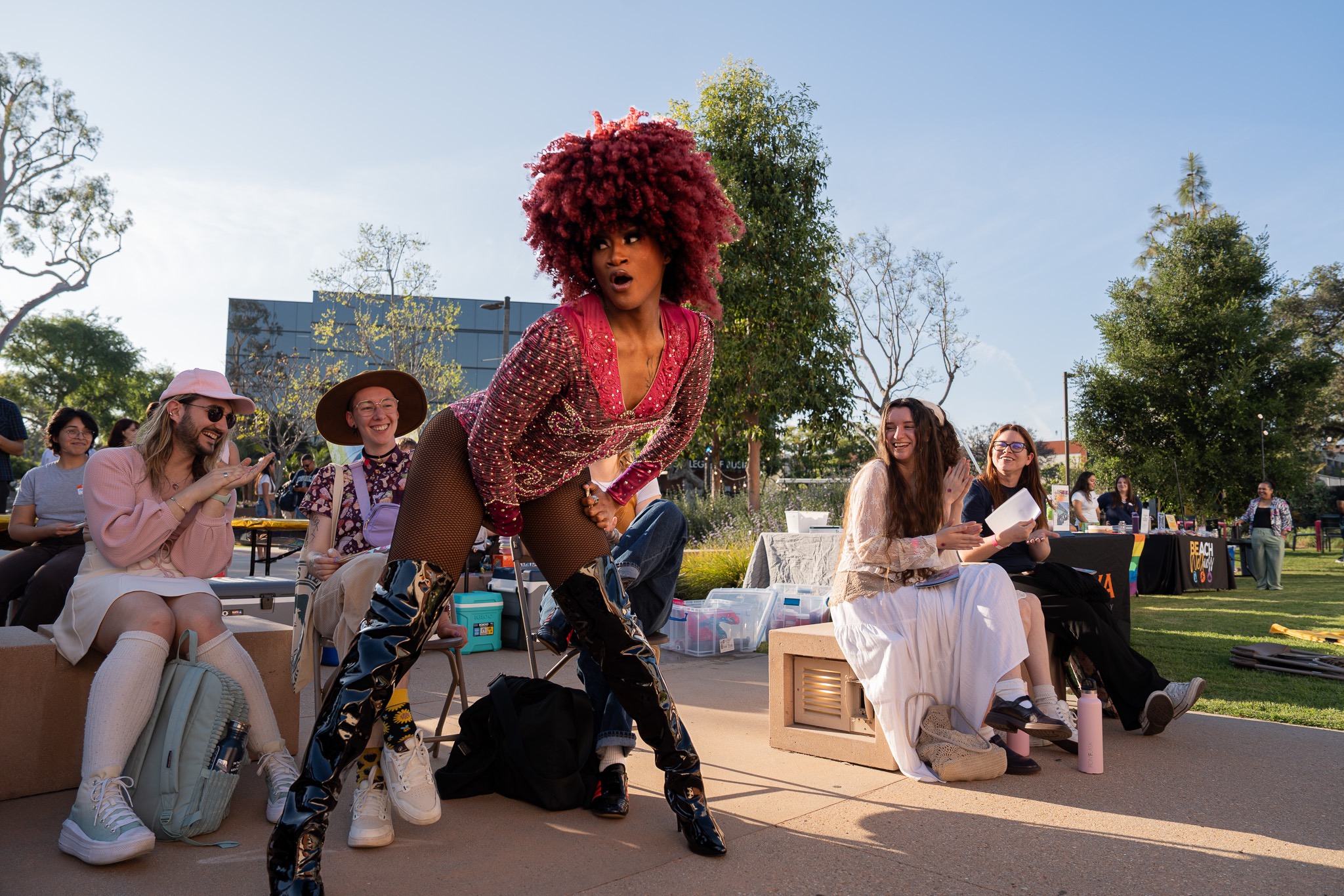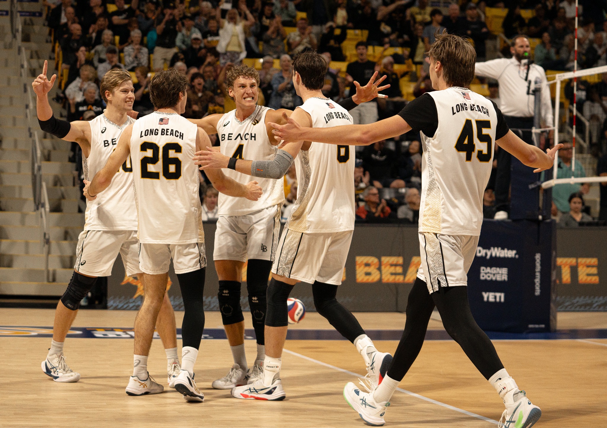 No. 3 LBSU celebrates a point during its five-set victory over No. 5 UC Irvine at the LBS Financial Credit Union Pyramid on Friday, April 17. Charlotte LoCicero | Long Beach Current